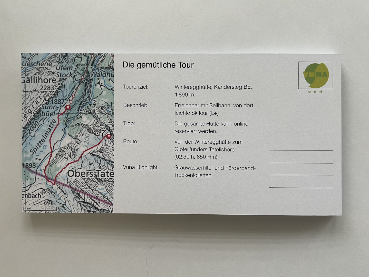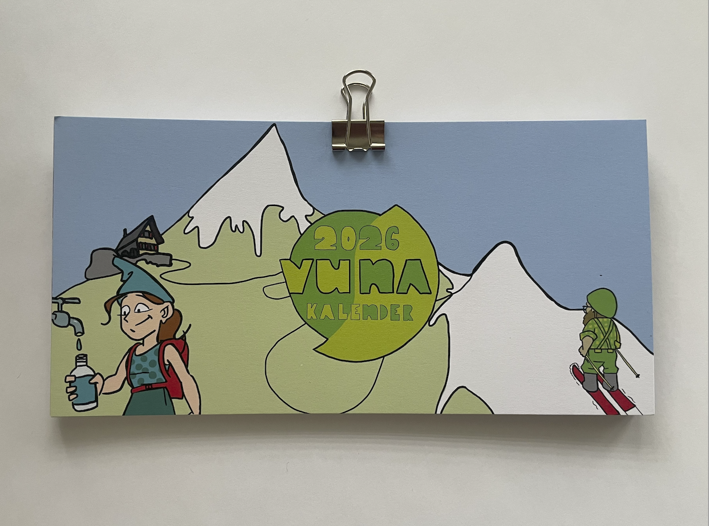 The calendar shows a route to a Vuna facility for each month – either as a ski tour or on foot.